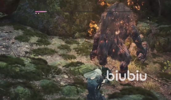 这个怪物是直立行走的牛形怪物,用的武器是一把巨斧,动作比较笨重,在它劈砍的时候躲远就不会受到什么伤害。这里使用镰鼬风技能会好一点,辅以带炎刃冲刺打伤害,随时迅身拉远距离保持安全,把它打倒地,它基本就是任玩家暴揍了。
