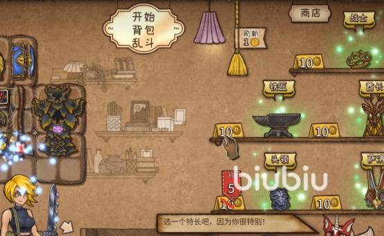 铁匠开局的装备随意选,优先选择格子和打造装备,一定要开局的时候至少拿一个香蕉,后续有用。如果想合成出铲子,最好在前两回合合出来,太晚了就不划算了。铲子需要一个扫把和一个铁锅才能合成。我们的主武器是双刃斧,搜装备的时候,不要漏掉战斧,还有一件事,那就是有猪拿猪,有宝石盒拿宝石盒,保证自己的经济和属性加成,让自己不至于在前期血量就输得太多。