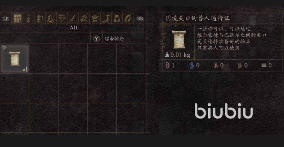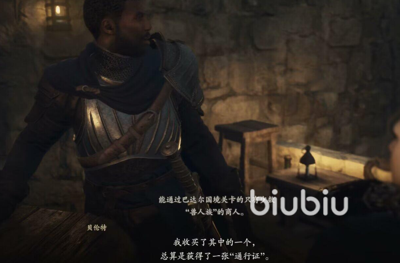 我们需要跟游戏内的NPC贝伦特花钱买到这个通行证,在被士兵盘查之前一定要先带上兽人的面具,因为这个通行证只有少量的“兽人族”商人才能用,之后就可以凭借证加面具光明正大的进去了。