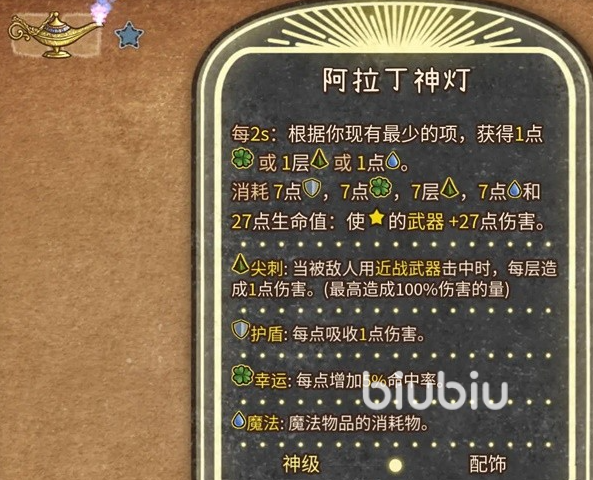 该流派的思路核心就是神灯,这个道具2秒就可以根据玩家当前最少的一项数值,来获得1点幸运,1点尖刺或者1点魔法。而通过消耗7点防御,幸运,尖刺,魔法以及27点数生命值,可以换到27点的武器伤害加成,实战就是用它消耗各种数值来提高神圣长矛的攻击。