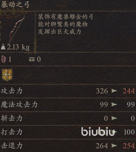 越早拿到这把弓越划算,到后期这些数值你就看不上了。244的攻击力在前期武器中已经算不错,关键是254的击退数值可以让你每一箭都会让敌人硬直很久,使用“连射”技能对手几乎动不了就被活活射死了。