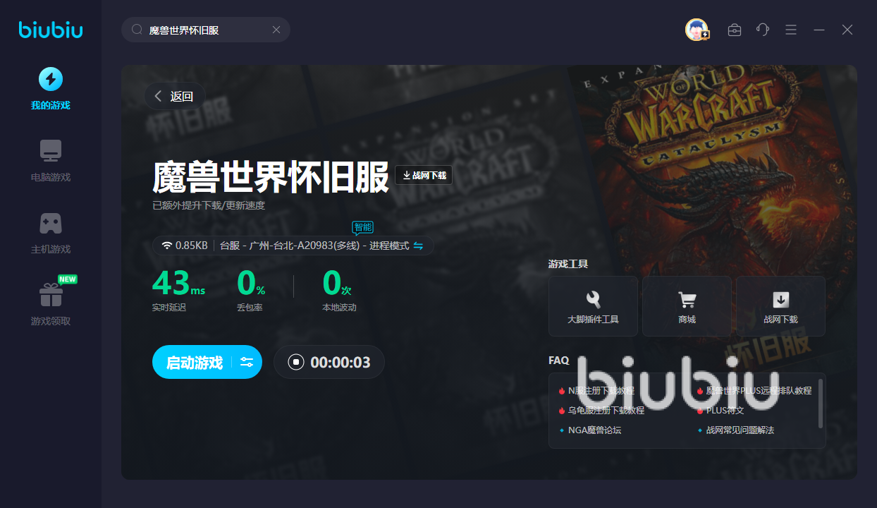 2024年04月07日 17:05 来源:白银至漩涡鸣人平常大家在玩魔兽世界怀旧服掉线频繁怎么办?之所以掉线,是因为网络不好。这时可使用biubiu,就能轻松优化网络,让你安稳地开启每一次屠魔任务。毕竟每次开荒刷副本的时候。都要打上很长一段时间,万一掉线的话就会导致任务失败,甚至不能捡取最终的战利品,所以最好先加速才玩。