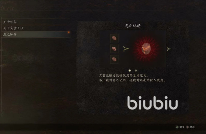 你也可以在战斗倒下后复活自己,不过除非是最终BOSS战,不然大部分情况都没什么必要,因为最终BOSS血量比较高,时长也很久所以重打比较麻烦,而且打完也就通关了,有龙之脉动就用,平常的话阵亡之后重打就行,这种稀有道具能省则省。
