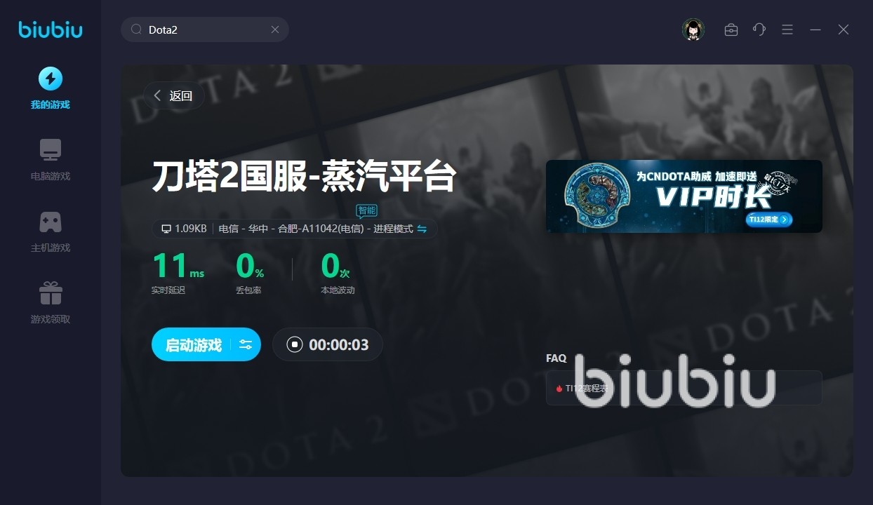 打开软件就会发现,平台针对刀塔2的部分平台是开启了限时免费加速的,也就是说即使不是平台会员,玩家也可以享受到专线的加速效果,到时各位只需把游戏添加到游戏库中,就能针对性地开启加速了,真正意义上为玩家实现即点即用的地步,即便是新人也能快速上手。