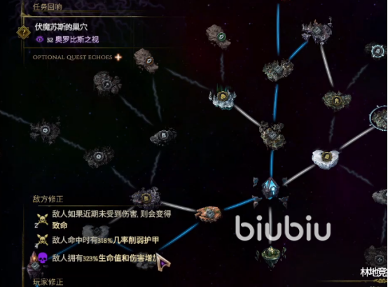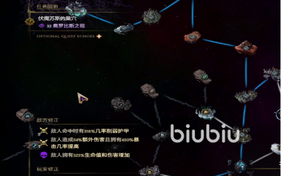 在打BOSS之前,我们需要了解一个内容:敌方修正,这是游戏特色,我们会给怪物上词条,也就是在左侧会显示敌方获得的buff,比如削弱我们的护甲,对我们造成暴击等等。我们每完成一个任务回响,就会将这个回响的敌方修正增加到左侧buff栏中。如果我们在这里叠了太多的伤害词条或者防御词条的话,BOSS就会变得很难打或者伤害很高。所以我们要尽量消除这些类型的词条。办法也有,我们找一些新敌方修正的词条,将这个BOSS击杀,这些就会替换原本的词条。举个例子新敌方修整为:“亡灵敌人拥有112%伤害和生命值提高”,可以用这条,替换“敌人造成54%的额外伤害和450%暴击几率提高”。