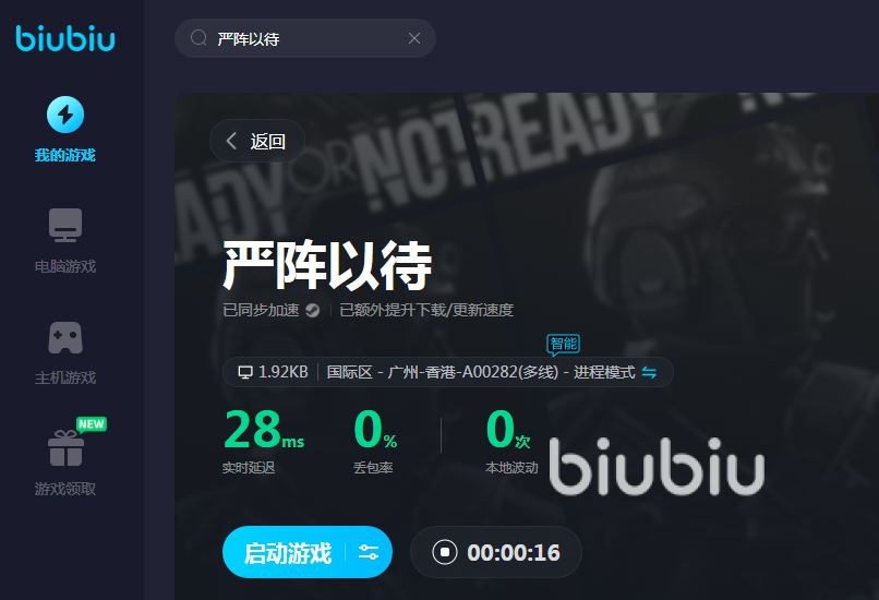 再来教大家biubiu的使用方法,打开软件以后大家可以清楚看到它的每个功能区域,板块区分清晰,界面简洁又大方。大家搜索到严阵以待以后随时都可以加速了,目前biubiu支持的是国际区加速,一键启动加速非常方便。