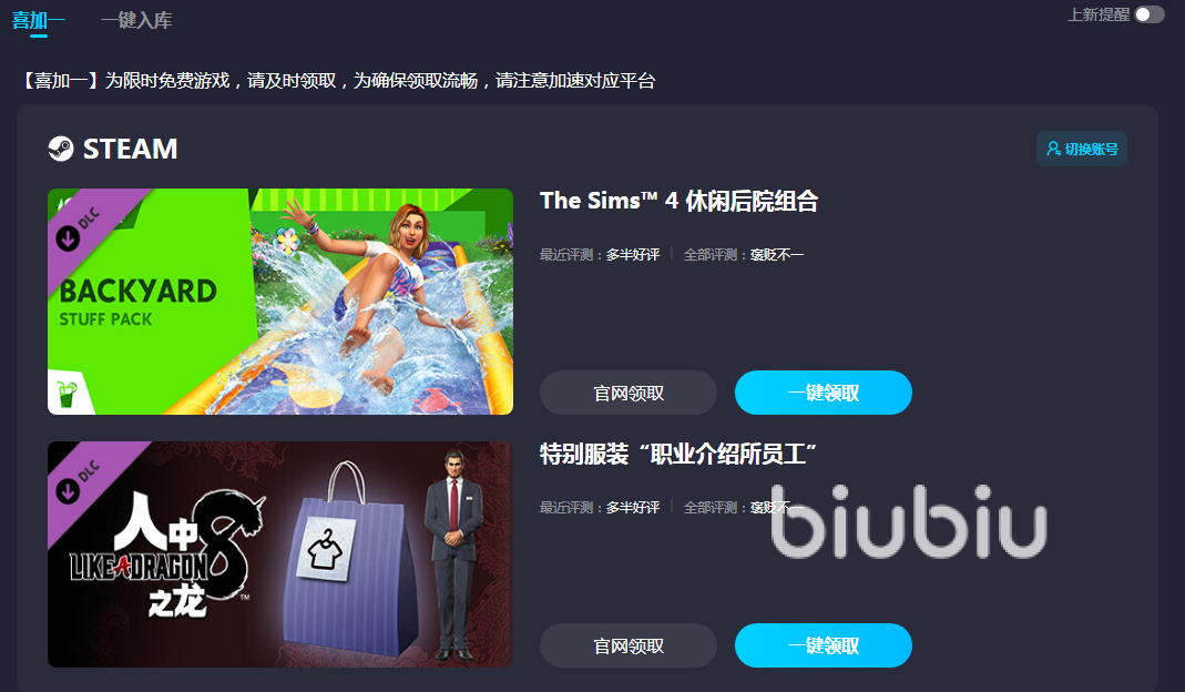 喜欢玩steam游戏的小伙伴现在关注游戏领取,就有机会免费领取平台游戏。这些游戏都是biubiu加精挑细选出来的,好玩又耐玩,完全免费不需要任何套路,只要按照系统指引的方法来领取就可以了,无形当中又给大家省下一笔买游戏的钱。