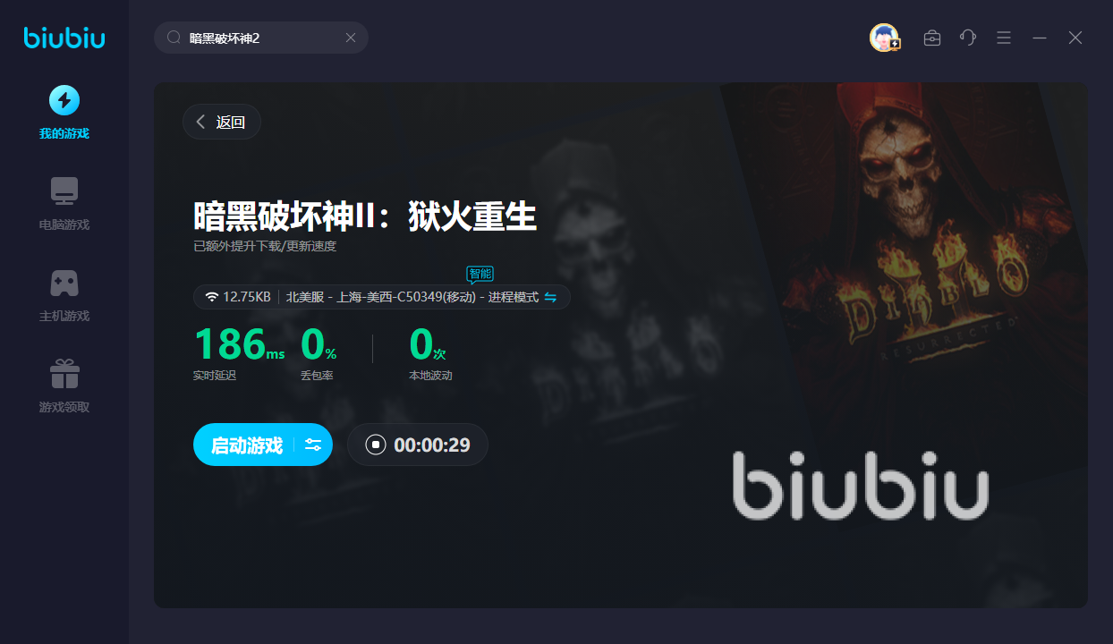 若是玩暗黑2的途中延迟高的话,就不能顺利地释放魔法或者战斗,让boss一爪子拍死。有了biubiu之后,即可有效降低延迟。不管网络多卡都能与boss拼命,直至最后一刻。如果与人生死决战的时候掉线,那就会将你身上的装备拱手让人。有了加速器后,即可降低波动率,安稳地开启每一场对决,让你充分发挥自身战力,更快地消灭你的对手。