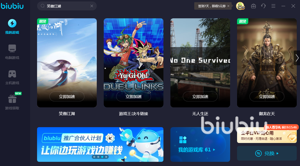 如还可让新老用户享受免费的加速时长,新用户通过注册登录就可领取到官方赠送的24小时加速时长,还可使用兑换码的方法领取免费加速三天的福利。具体的方法需要玩家输入兑换码【biubiu不卡顿】即可,这种方法不仅适合新用户,老用户同样也能使用。平时经常会因为网络而影响游戏体验,不想再感受掉帧卡顿的玩家,都可趁着现在官方推出的福利免费体验一下。