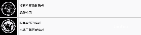 首次把一个区域内物品全收集就是【收集大师】,收集了所有猫咪就能跳杯【比三餐更爱猫咪】,把所有景点收集拿到【漫游诸国】。