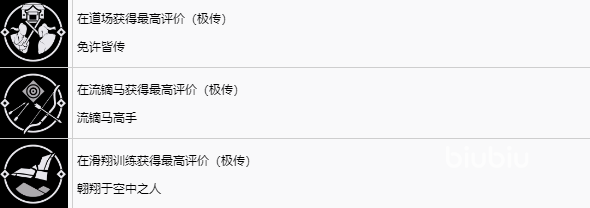 第一次更换长屋的布置,就拿到【转换心情】,这个第一章剧情里面会引导玩家的,第二章的时候就会解锁留魂录,就是重新读档重做任务,随意完成一个就能跳杯【穿越时空】。在千叶道场战斗中得到最高评级,就可以拿到【免许皆传】,可以在简单模式下进行哦。在流镝马训练场拿到最高评价得到【流镝马】高手。滑翔训练就是【翱翔于空中之人】,炮击训练则是【炮术名人】