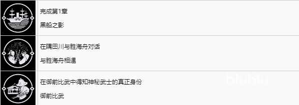完成序章则可得到【脱藩】,知道自己的搭档还活着得到【幕落与幕启】,顺利抵达目标位置可以拿到【潜入监狱】,第一章主线结束拿到【黑船之影】,找到胜海舟并且完成相应剧情得到【与胜海舟相遇】,进去御前比武环节并且知道神秘武士的身份可以拿到【御前比武】。