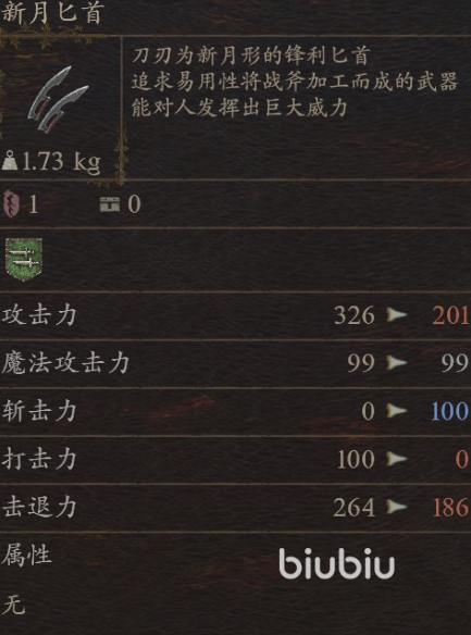 这把武器在维伦沃斯的武器商店就能获得,具有201的物攻以及186击退和100斩击,作为前期武器装备还算不错,可以用到剧情到巴达尔,如果你是盗贼的话可以使用,或是随从是盗贼也能用,面板足以让你渡过早期开荒。