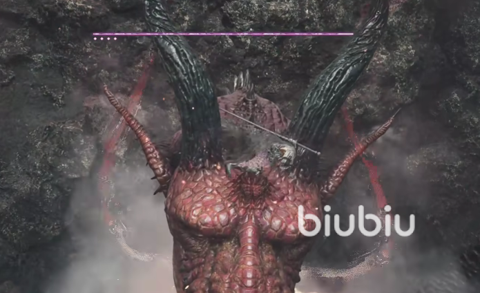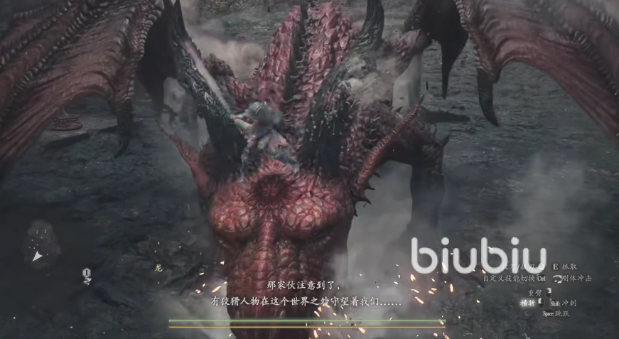 这个BOSS话比较多,一边说开场白还一边摇头摆尾,在它头低下来的时候就可以趁机爬到它的头上,只要站得稳就可以偷袭成功先打第一波输出。直接使用横斩先打血条,能打多久就多久。怪物受痛就会挣扎,只要不掉下来就一直打。