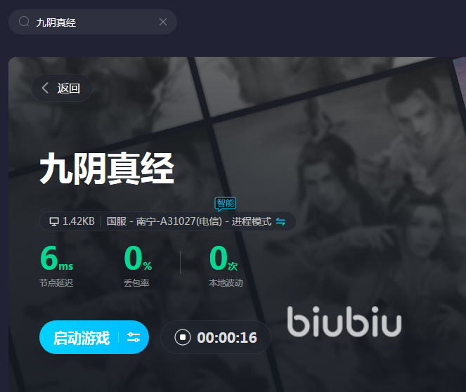 biubiu一键启动的方式很友好,对于九阴真经它是可以免费加速的,而大家新用户试用结束后还想继续体验的,可以用兑换码【biubiu不卡顿】获得三天免费加速,这样就能加速玩其他的游戏了。
