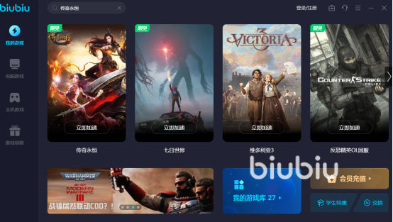 作为一种新老用户都可享受免费游戏加速时长的加速器,biubiu通过下载以后能有效解决网络不稳定或者是有延迟的问题,使用户在游戏时迅速的登录,快速进入游戏当中。加速器还支持全球的很多正版游戏,涵盖全球的加速节点,如果游戏因为网络而出现问题的话,使用这款加速器加速的时候会优先选择好网络。