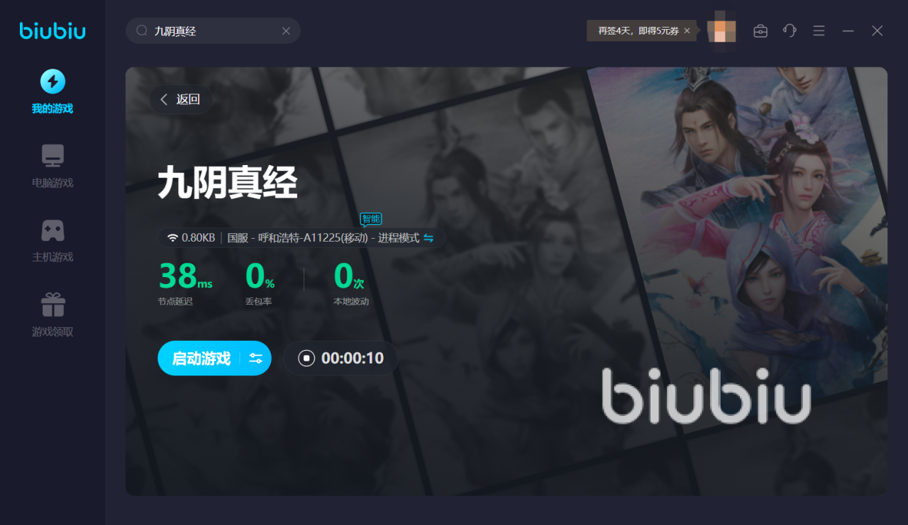 游戏当中大家要体验到的还有帮派战斗和各种主线副本任务等,这些玩法对网络的要求都是比较高的,网络稳定性对大家能否成功也有着至关重要的影响,biubiu加速器为九阴真经提供了专项加速线路,降低延迟的过程中还确保稳定畅快的加速体验。现在你们去点击上门的按钮就可以下载加速器,首次下载体验的用户可以领24小时免费时长,平台当中也推出了一些受欢迎的活动,小编比较感兴趣的是兑换码领时长活动,那就要把【biubiu不卡顿】用小写的方式输入窗口来领取三天免费时长,这样大家再去体验游戏的话就会更加稳定和流畅了。