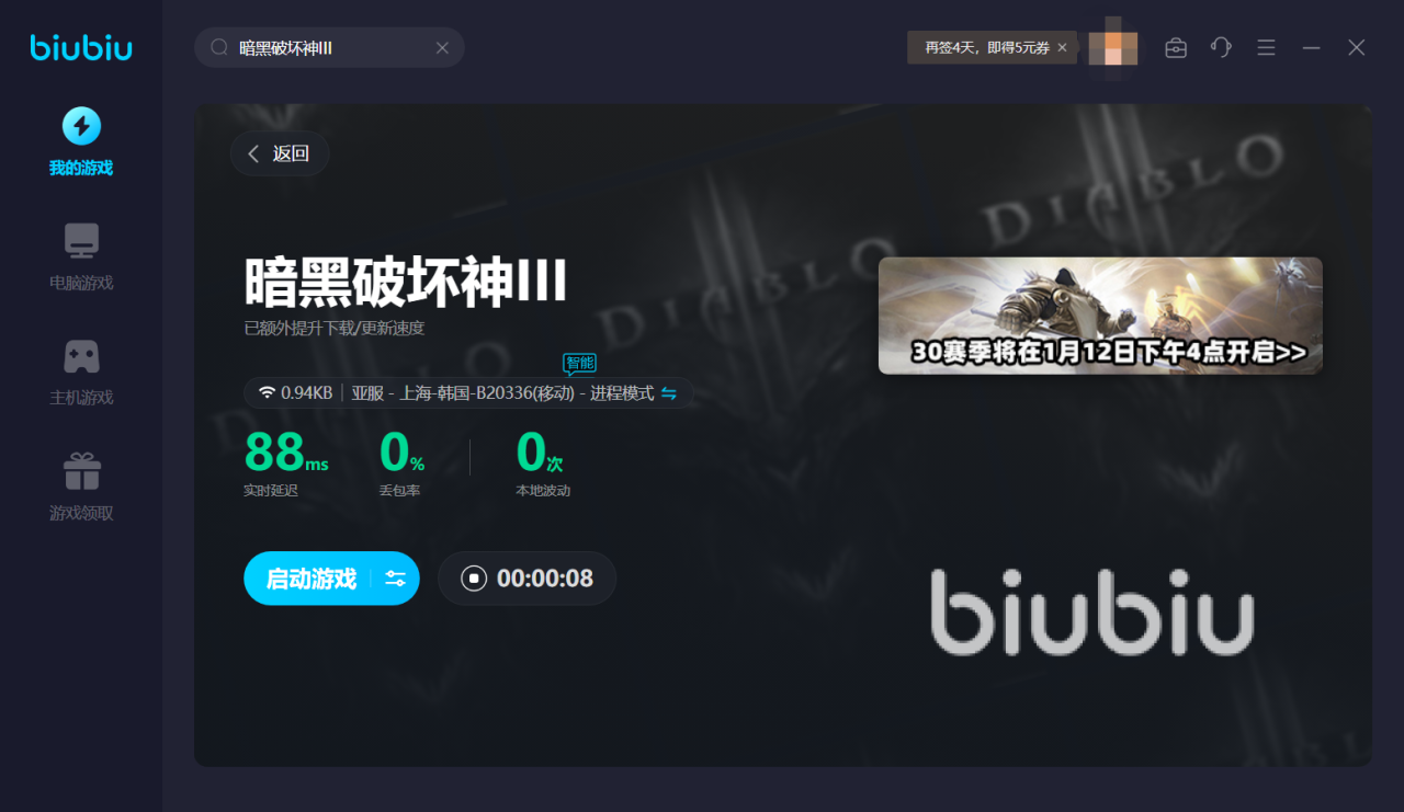 这种刷怪任务需要大家来完成提升能力,有个别黄金时间你面对的怪物数量较多,快速的消灭他们,你必须要拥有流畅的网络,以免让他们趁人之危将你杀害,平凡的被杀害也会损失经验值,为了不被杀害不损失经验值大家就应该借助加速器来体验游戏。现在去下载加速器的新人可领取24小时免费时长,这是平台专门推出与针对新人的一项福利活动,还有一种就是平台中所有用户都可以参加的兑换码领时长活动,需要你将【biubiu不卡顿】输入到对应窗口来获得三天免费时长。