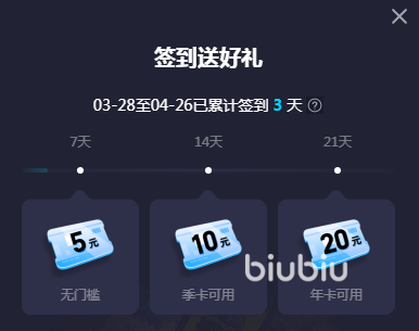 那么biubiu的价格到底便宜到什么程度呢?每个月只要省下一杯奶茶的费用就可以充值会员了,大家现在能参加签到领优惠券的活动,只要在4月26日之前累计签到满足对应的天数就能获得充值抵扣券,最低只要累计签到7天就能得到5元的无门槛券。同时它还有学生用户专属折扣等优惠活动,用户可以根据自己的需要来参加。