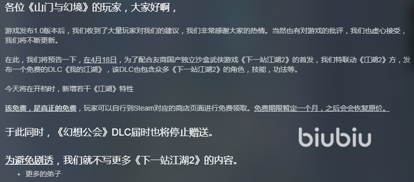 另外此游戏为了配合下图里友商新上线的独立沙盒武侠游戏,特地与它联动并推出了一款免费的DLC“我的江湖”,它包含众多《下一站江湖2》里面的角色、技能以及功法等内容,它的领取时间是从4月18日开始,免费的期限暂定为一个月,过时就得用恢复原价才能买到了。