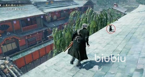 第二个就不是那么好找的,它的位置在屋顶的木板高台上面。第三个猫趴在地上休息,玩家可以从地图上找到,找到猫以后玩家就可以回到薄云大夫那里交差了。注意这里会遇到两个恶棍,玩家需要帮忙赶走。