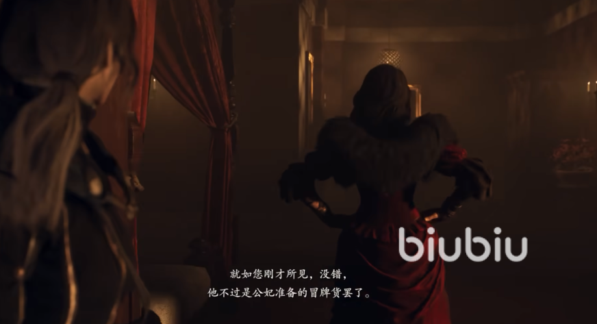 进入门后就会进入一段剧情,在士兵追击的时候,威尔艾米娜帮助了玩家,这个也是以后可以建立友好关系的NPC。然后她会带着玩家来到窥视孔,看到房间里饮酒作乐的假王,王妃进来之后训斥了他,玩家也因此得知真相,原来她这么做就是想以后自己的儿子斯温当上国王。
