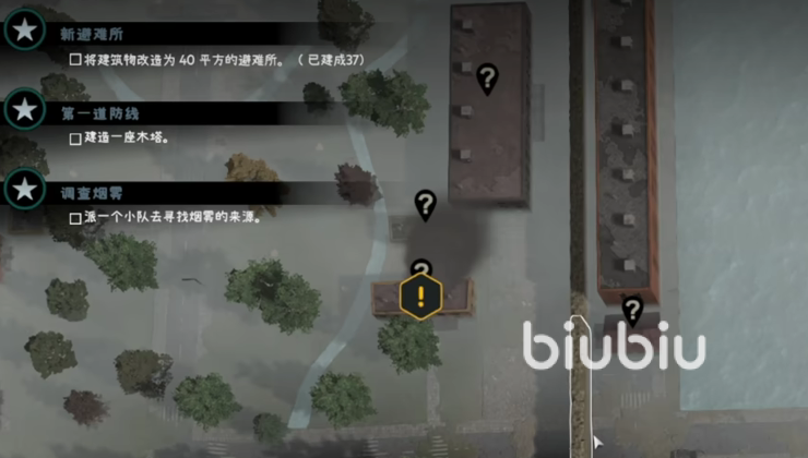 仔细观察地图,还会发现有建筑物会冒烟,头上的标志也会变成感叹号,这就代表该地区可能有幸存者,而玩家需要做的就是派遣自己的小队前去查探详情。但是过去的路被墙堵住了,要砸开才能过桥。