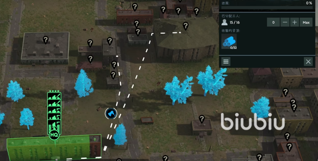 我们可以在门口位置安排一些工人开始收集材料,使用鼠标左键拖过所需探索区域,树木显示蓝色就代表已被选中,然后在右上角通过点击加减按钮进行工人分配,完成之后工人就开始砍树收集木材了。
