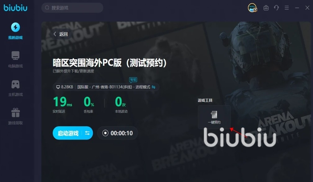 在biubiu客户端里面输入游戏名称,就可以看到PC版本的加速方式,点击进去能看到有【一键预约】功能,用上之后就可以帮助玩家获取测试资格了,运气好的小伙伴是可以得到的哦。