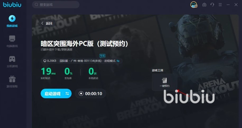 在biubiu里小伙伴们是可以直接搜索暗区突围游戏名称,然后就能看到相应的游戏板块了,在这里就可以预约,后续游戏上线的话,小伙伴们就可以直接用biubiu给它进行加速了,开局就能让大家拥有一个不错的加载体验,尽量避免出现掉线卡顿的问题。