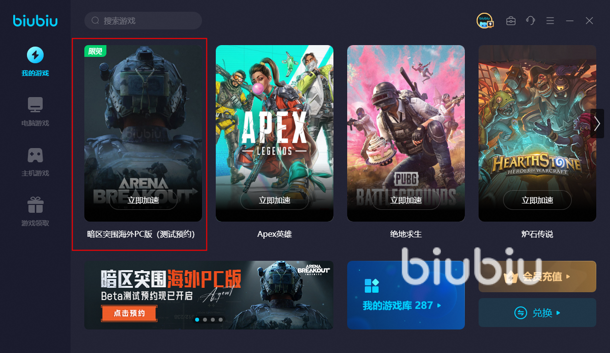 在这个平台里小伙伴们可以搜索到不少好玩的端游,其中预约暗区突围海外pc版本的话,还能在4月23号和5月8号期间享受限免加速的福利,感兴趣的小伙伴千万不要错过,biubiu的性能还是很好的,基本上不会发生闪退卡顿的情况。除了本次的限免福利,游戏不定期也会展开其他游戏的限免活动,说不准其中就有小伙伴们正在玩的。