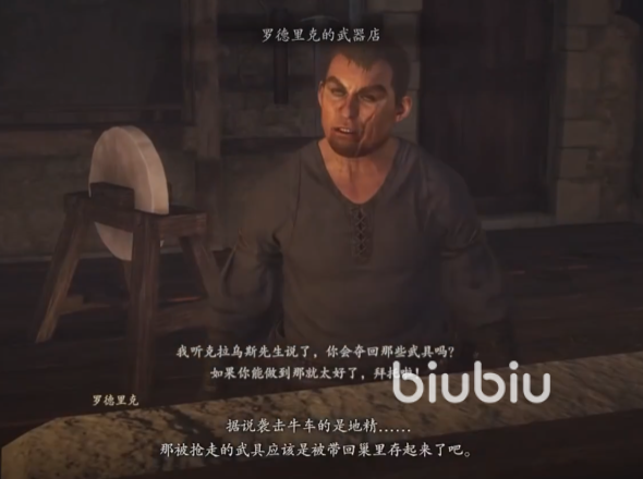 在这里我们得知想要换职业是需要经过手续的,其中最重要的就是相关的武器,但是现在并没有,需要玩家前去合作的武器商人那里咨询一下。出门找到武器店,店主罗德里克就在店里面等待着玩家,运送武器的牛车被地精袭击了,这些装备都被夺走了,其中就有双手剑,需要玩家去它们的巢穴里面进行搜寻然后带回来。