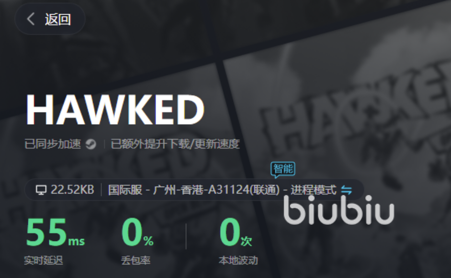 其实HAWKED每一场战斗基本上几分钟就可以搞定,可以说节奏相当之快了,枪林弹雨的画面下不得不加快移动角色,绚丽的特效有时候真的会让人出现眼花缭乱的感觉。所以游戏对于新手玩家来说还是有一定门槛的,当然网络突然掉链子也会影响到整个游戏进展和结局。小编体验了下不使用加速器真的是举步维艰,让你卡到怀疑人生,甚至出现强制退出的情形,所以还是让biubiu去帮助大家解决这些棘手的网络问题吧。
