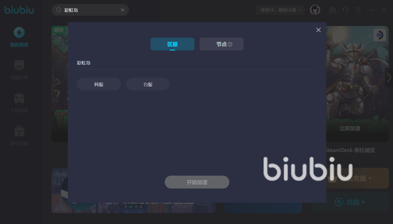 彩虹岛由于是韩国那边引进的游戏,所以目前支持两个区服,一个是韩服,一个是台服,而多数国内的玩家在游玩该游戏是时候会明显出现卡顿问题,就是走个地图都能卡两分钟左右的时间,这时候biubiu加速器的多渠道加速的功能就体现出来了,不论是那个区服的玩家都可以进行加速,体验流畅的游戏环境,并且新人在注册后便获24小时免费加速,以及新老用户使用兑换码【biubiu不卡顿】可获3天免费的使用权哦!