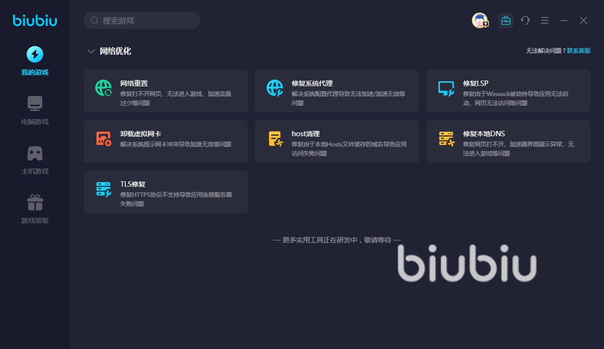 使用biubiu可以解决大家在网络方面的很多问题,除了上面所说的一键优化之外,针对在运行过程中系统出现的其他问题,也提供了一些免费工具。大家可以直接在主页面右上角工具箱中找到这些工具,并根据实际情况去选择使用。例如网络重置、修复本地代理等,这些都可以一键解决很多问题。对于电脑小白来说就无需查找各种攻略方法,直接在biubiu中就能一次性解决。当然也少不了为大家提供各种攻略来解决游戏里的玩法问题,可以直接在专区中免费查看,还可以在社区中去看很多玩家发布的动态,也可以自己在这里发布心情。