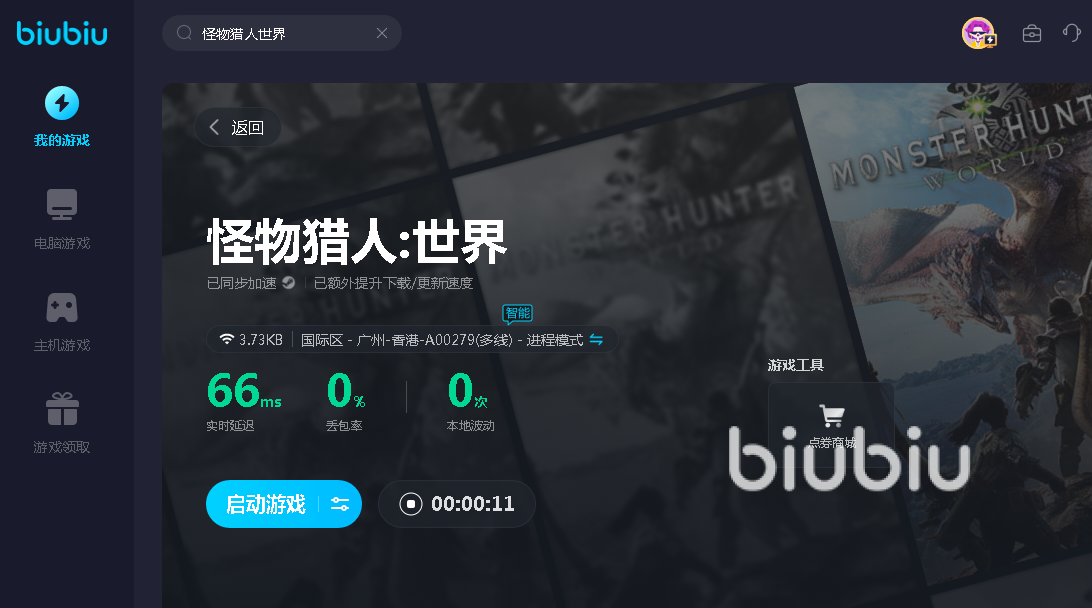 不知道怎么下载的小伙伴,可直接点击上方链接下载安装,当然也可前往官网进行下载体验,官网内还有关于怪物猎人世界的游戏攻略,助力新手玩家更好的了解游戏玩法,此外为了让大家的游戏体验可以变得更加丰富,biubiu不但上线了PC端的加速连接,同时也为我们提供了主机游戏的加速,大家都是可以一键体验的。在加速界面我们还能直观的看到当前的加速状态,延迟以及丢包率都是可以查看的,还有当前的加速时间等等,同时大家还可直接启动游戏,快速的参与游戏对局。