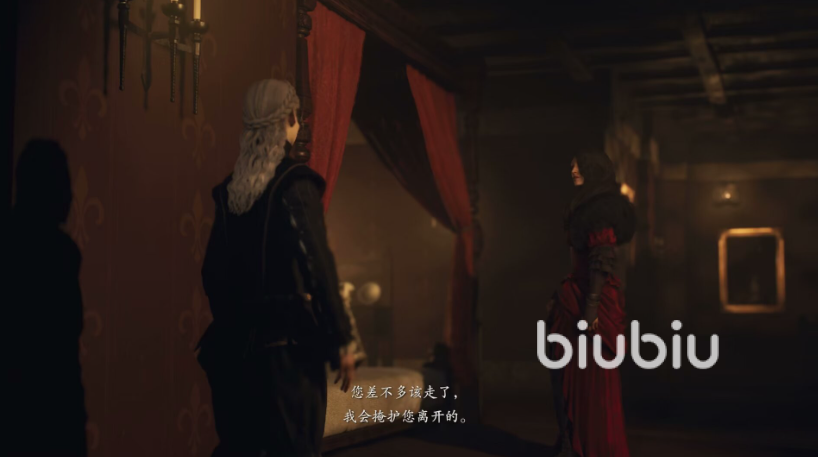 打开暗门之后进去对直走,很快你就能触发过场动画,很快你会被一个叫做威尔艾米娜的贵族女性发现,守卫发现动静之后开始搜索,她帮把你藏在了房间,原来她也在暗中观察伪王的阴谋,与她对话之后她奉劝你最好早点离开,从窗户跳下去逃跑,再去酒馆找贝伦特对话,舞会任务就会完成了。