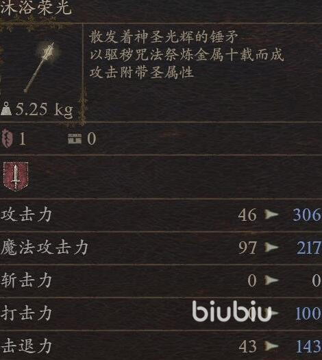 圣光系单手锤,沐浴荣光是一把散发着神圣光辉的锤矛,以驱秽咒法祭炼金属十载而成。这把武器大部分玩家都称之为骷髅鬼见愁,而且晚上都不用开油灯,因为这件装备它自带亮光。