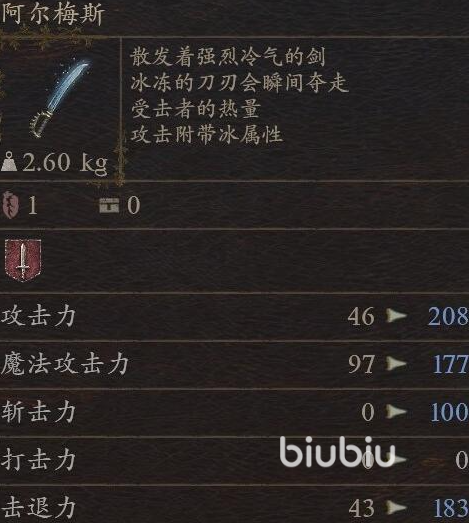战士的冰属性单手剑,阿尔梅斯的外观是一把散发着强烈冷气的剑,在未强化的情况下就有着不俗的物理攻击力,自带常驻百分之一百二十的冰霜伤害,配合非常高的斩击力跟击退力属性,可以让我们用到一周目通关。它的获取位置在关口旅店武器店,找到商人进行购买。盗贼的冰霜之刃是使用冰山出土的矿石,来锻造的一把匕首,刀刃上时常有一层薄霜,攻击时会附带冰属性。它拥有极高的物理和魔法攻击力,两种数值都超过四百,常驻会有百分之四十五的冰属性伤害。