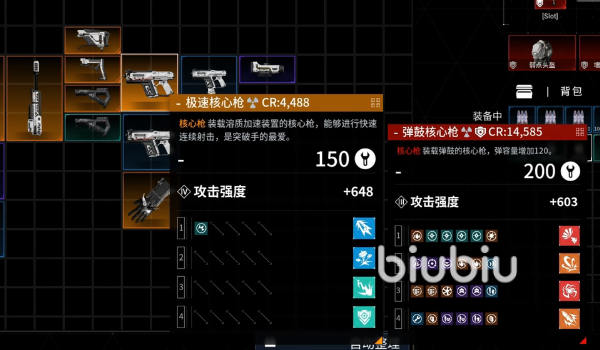 核心枪是整体装备的主要部分,其中极速核心枪和弹鼓核心枪这两款,是在游戏前期非常容易获得的绿色以及蓝色装备。枪管是枪械增伤的主要部件,所以我们在选择的时候尽量选择攻击强度较高的,比如涡轮枪管以及重型枪管,这两种都带有比较好的通用性,基本不用太经常替换。