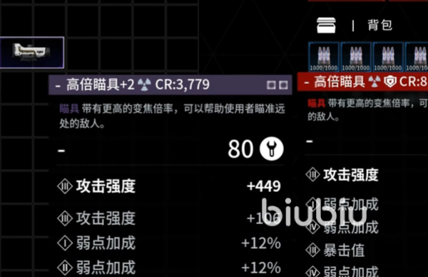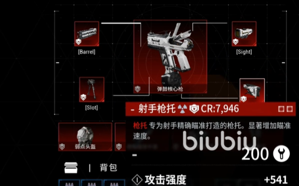 在选择枪械下挂的配件属性时,我们优先选择带有增伤以及弱点伤害的词条就可以了,比如榴弹和激光这种功能性的配件。瞄准镜因为带有更高的变焦倍率,可以帮助我们瞄准远处的敌人,因此我们选择高倍类型的,词条方面优先选择带攻击强度和弱点加成的即可。