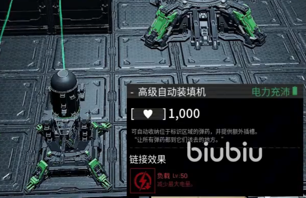 自动装填机会将绿线范围内的弹药全部收纳,并且提供额外装填空间,同时在编辑模式下我们可以发现它的绿线范围是非常广的,因此它供给的弹药只要能在顶端无人机的位置,与炮台中心连上线的话,那就代表装填机能给炮台进行供弹。