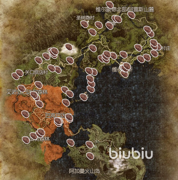 位置方面你可以凭借这张插图来进行对比,如果你觉得自己找比较麻烦,你可以去招募一个比较熟悉路的随从。本作的随从会凭借其他世界的经验来学习,包括记住素材和隐藏地点所在的位置,也就是说他们可以带路找或是自己主动拾取这些道具。