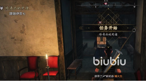这时躲在后面的伊贺七就会出现,带我们进入秘密仓库,为了向我们表达谢意,他表示这里所有的东西任我们挑选,我们都可以带走。然后我们就会获得捕火方,他表示需要我们熟悉一下这件武器,所以会安排两个小关卡,一个是用捕火方点燃炸药桶,一个是用捕火方攻击盗贼。当我们将这两个任务都通过后,他就会告诉我们这个武器归我们了,并且表示他要去找另一个帮手福泽谕,后会有期。