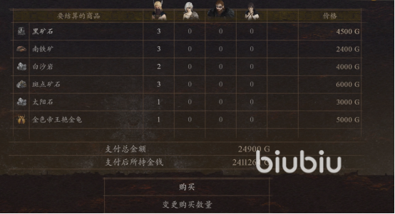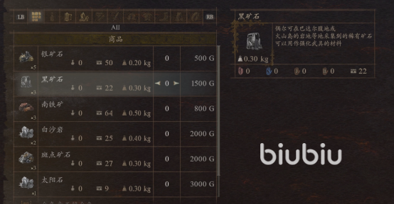 首先,我们可以前往巴达尔地区,礼拜神龛西北处的篝火处,找旅行小贩泽葛莱斯,他会固定售卖黑矿石、太阳石等。一个黑矿石需要1500G,我们可以根据强化武器需要的数量进行购买,大约七天刷新一次。