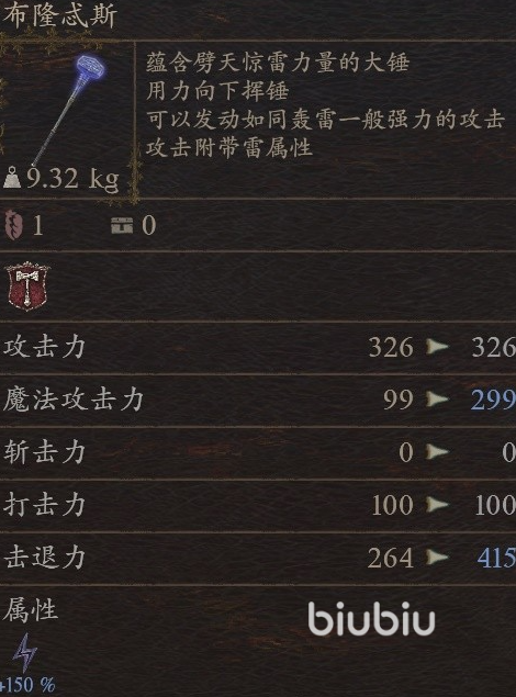 从属性上来看,它拥有326物理攻击以及299魔法攻击和415击退,适合在中后期使用,但作为毕业武器这个面板估计差了一点,150%的雷属性武器伤害,外观微微发光也是挺帅的。