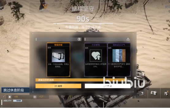 等一波结束后就会有提供布置防御时间,等待继续作战,这时我们左侧会显示提供空投补给,而右侧会有敌人属性提升或者恶劣天气加入等debuff。我们根据自己的情况来选择,建议前期可以选择恶劣天气,因为恶劣天气装置我们可以摧毁,并且只有一轮影响。