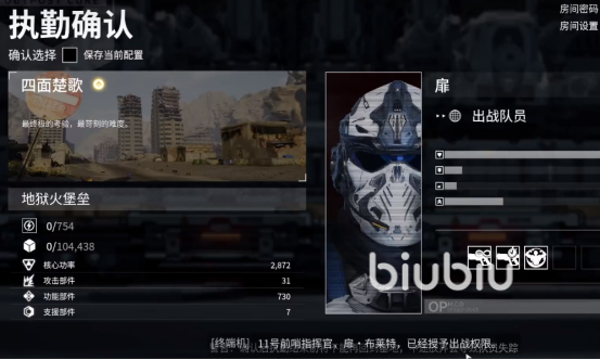 进入游戏后我们选择执勤关卡,然后选择四面楚歌终极考验,就会出现即将前往执勤的地点:地狱火堡垒。在前往哨点之前,我们需要对成员、装备以及溶质等配备进行调,这里建议可以和其他玩家组队挑战。