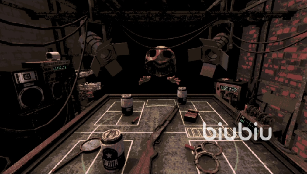 如果打自己是空弹,那么我们就会获得连续射击的机会,我们可以选择对准自己,也可以选择对准恶魔。假如我们被击中,就会被复活,继续开始比赛。等进入第二关就会引入道具系统,比如手铐可以将恶魔铐起来跳过一次回合,放大镜可以看清枪里目前的子弹情况。游戏中我们学会在适当的时机,合理的使用这些道具,通过它们不同的功能,帮助我们赢得比赛的胜利。第三轮和第二轮类似,但是血量加了2点,同时当血量降低到2点时,则不可以再使用香烟进行回血。