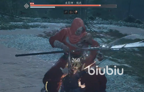 当敌人开始向后退的时候,我们需要进行突刺来拉近身位进行攻击。到了第二阶段BOSS会释放些烟雾,同时周围出现很多皮影小人,这里只需要释放几次蓄力刀就能清除。而当BOSS身上出现蓝光时,我们需要不断地攻击来减少他的真气,当真气清零时便能使用处决即可击败BOSS。